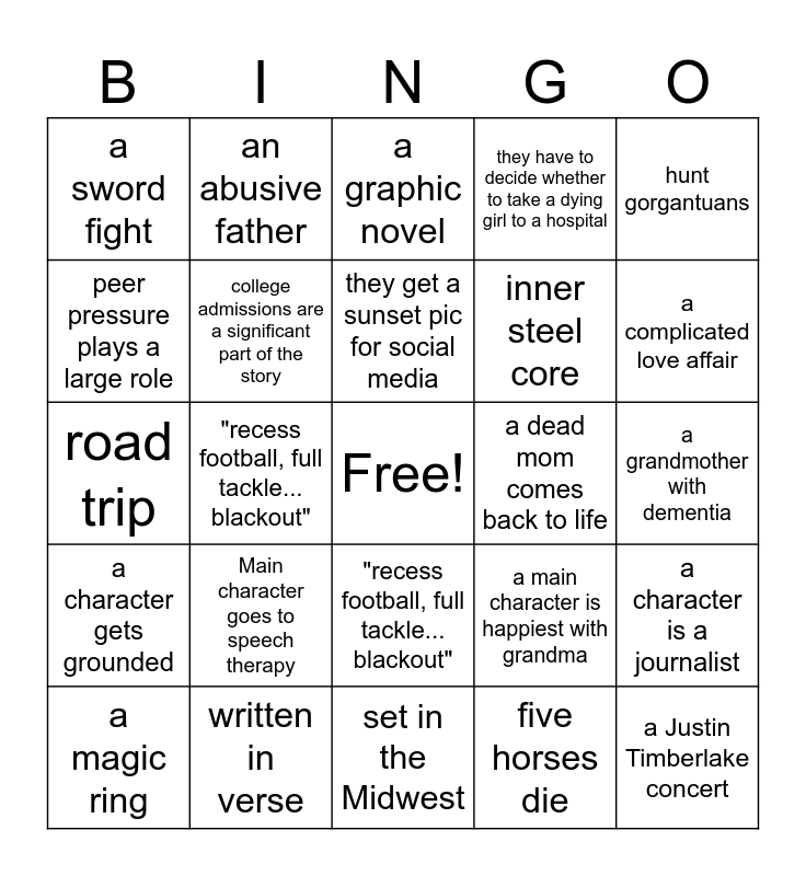 This bingo card has a free space and 38 words: a hidden identity, a complicated love affair, the spirit of St. Valentine, college admissions are a significant part of the story, a character is a journalist, Main character goes to speech therapy, they get a sunset pic for social media, a character would rather go to prison than accept help from him, hunt gorgantuans, inner steel core, "recess football, full tackle... blackout", they have to decide whether to take a dying girl to a hospital, a Justin Timberlake concert, a grandmother with dementia, peer pressure plays a large role, a character gets grounded, an artist brother, a graphic novel, they dig up grandma, literally, a dead mom comes back to life, a sword fight, written in verse, a complicated love affair, a magic ring, a cat is featured, set in the Midwest, a magic ring, war is a theme, "you help me, then I help you", take earrings off a dead woman, peer pressure played a large role, "recess football, full tackle... blackout", five horses die, an abusive father, character named Chef Ramon, a main character is happiest with grandma, road trip and based on the legends of King Arthur.