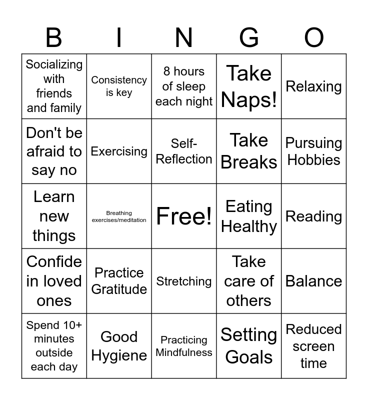 This bingo card has a free space and 29 words: Spend 10+ minutes outside each day, Drink lots of water, Breathing exercises/meditation, Journaling, Socializing with friends and family, 8 hours of sleep each night, Exercising, Practice Gratitude, Eating Healthy, Good Hygiene, Reading, Reduced screen time, Practicing Mindfulness, Setting Goals, Pursuing Hobbies, Tracking Progress, Stretching, Confide in loved ones, Relaxing, Learn new things, Take care of others, Volunteer, Take Breaks, Don't be afraid to say no, Take Naps!, Consistency is key, Balance, Self-Reflection and Acceptance.