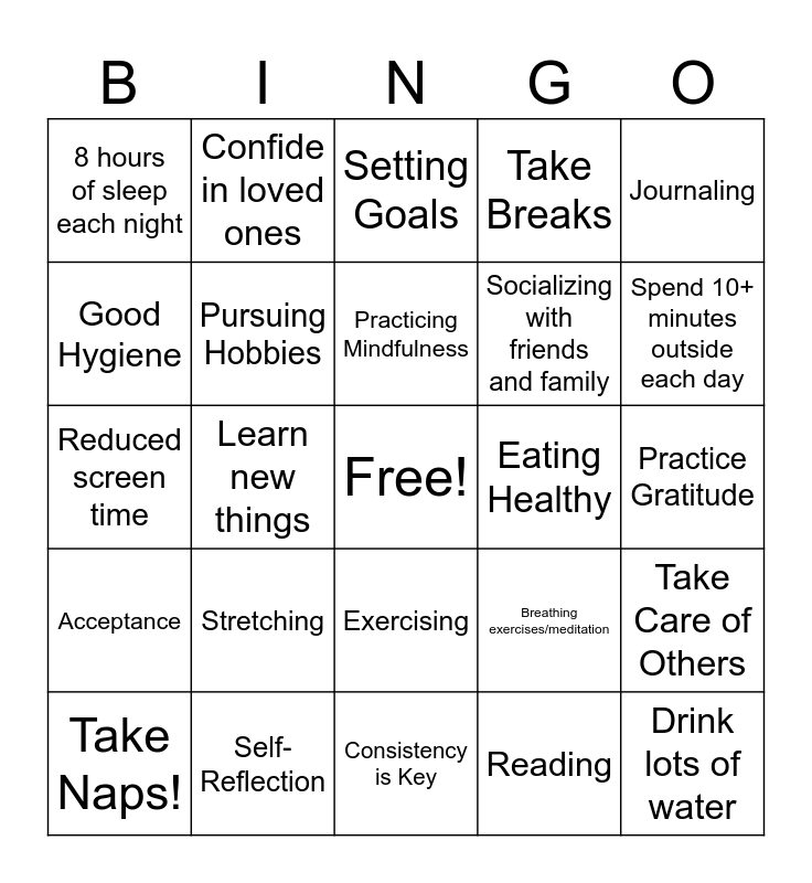 This bingo card has a free space and 24 words: Stretching, Self-Reflection, Practicing Mindfulness, Take Naps!, Journaling, 8 hours of sleep each night, Good Hygiene, Confide in loved ones, Eating Healthy, Exercising, Socializing with friends and family, Reduced screen time, Breathing exercises/meditation, Take Care of Others, Pursuing Hobbies, Reading, Practice Gratitude, Setting Goals, Spend 10+ minutes outside each day, Learn new things, Drink lots of water, Acceptance, Take Breaks and Consistency is Key.