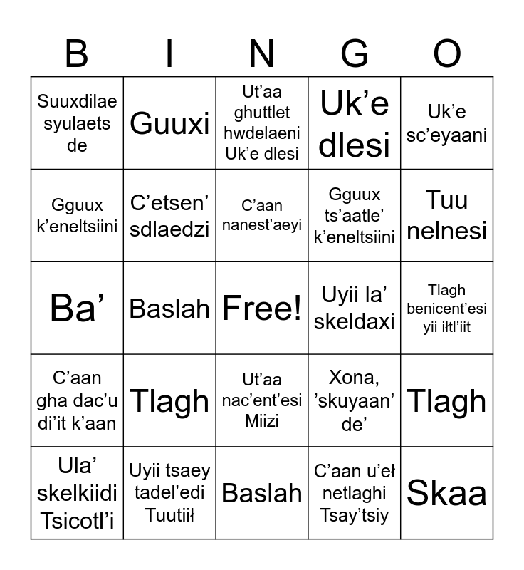 This bingo card has a free space and 43 words: Tuutiił, Skaa, Uyii hwdilaeni Nelkadi, Ula’ skelkiidi Tsicotl’i, Skaa, C’aan u’eł netlaghi Tsay’tsiy, Ut’aa ghuttlet hwdelaeni Uk’e dlesi, Sdali, Uk’e sc’eyaani, Uyii tsaey tadel’edi Tuutiił, Uk’e dlesi, Uyii la’ skeldaxi, Ut’aa nac’ent’esi Miizi, Tlagh, Gigi, Baslah, C’aan nanest’aeyi Gguux k’eneltsiini Gguux ts’aatle’ k’eneltsiini C’aan nal’oxi C’etsen’ sdlaedzi C’etsen’ zt’aeyi, Ba’, C’etsen’ zggan, Tuu nelnesi, Guuxi, Tuu, C’ebaa, Suuxdilae syulaets de, C’etsen’ kadit’aas ’, Tlagh benicent’esi yii iłtl’iit, Tuu sdikaas gguux keneltsiini snulaets de’ C’etsen’ iłtaes, Ts’aay’ nidinilae, Xona, ’skuyaan’ de’, C’aan gha dac’u di’it k’aan, Miizi, Tlagh, Gigi, Baslah, Guuxi, Tuu, C’ebaa, C’aan nanest’aeyi, Gguux k’eneltsiini, Gguux ts’aatle’ k’eneltsiini, C’aan nal’oxi, C’etsen’ sdlaedzi and C’etsen’ zt’aeyi.