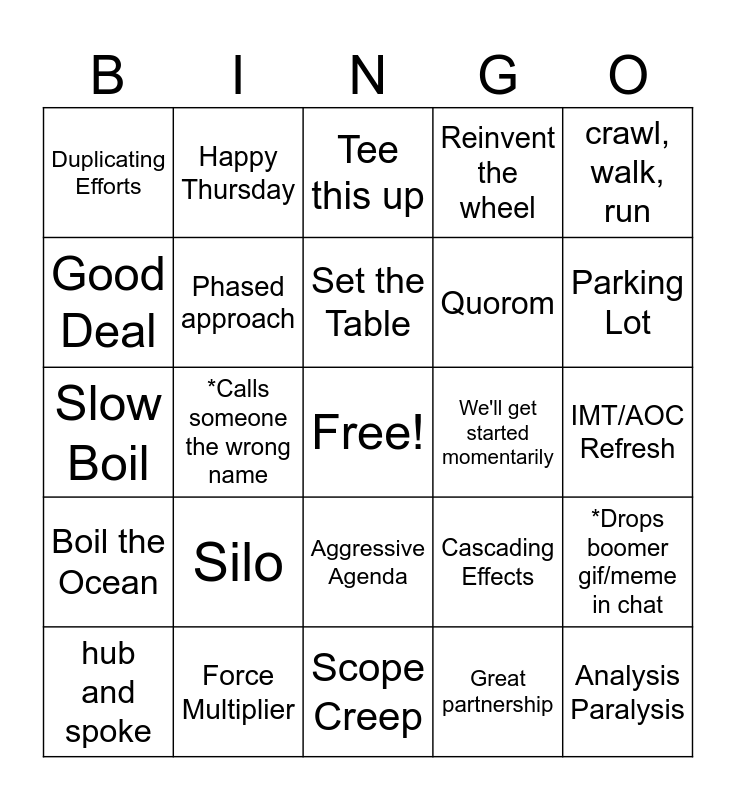 This bingo card has a free space and 24 words: Silo, Force Multiplier, Set the Table, hub and spoke, crawl, walk, run, Duplicating Efforts, Good Deal, Happy Thursday, We'll get started momentarily, Aggressive Agenda, Quorom, Slow Boil, Cascading Effects, *Drops boomer gif/meme in chat, Phased approach, Great partnership, IMT/AOC Refresh, Tee this up, Parking Lot, *Calls someone the wrong name, Analysis Paralysis, Boil the Ocean, Reinvent the wheel and Scope Creep.