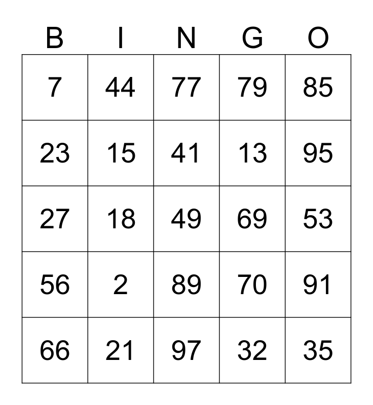 This bingo card has a free space and 24 words: 2, 21, 41, 66, 85, 7, 23, 44, 69, 89, 13, 27, 70, 91, 15, 32, 53, 77, 95, 18, 35, 56, 79 and 97.