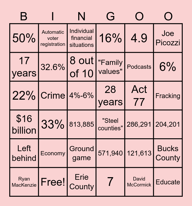 This bingo card has 37 words: 121,613, 571,940, David McCormick, 17 years, 33%, Act 77, 32.6%, 7, 4.9, Ryan MacKenzie, 6%, 16%, 22%, 4%-6%, Joe Picozzi, 28 years, Economy, Individual financial situations, Fracking, Crime, 50%, "Family values", 813,885, 286,291, Free!, 204,201, Automatic voter registration, Erie County, Bucks County, Ground game, 3.8, "Steel counties", Podcasts, Left behind, $16 billion, 8 out of 10 and Educate.