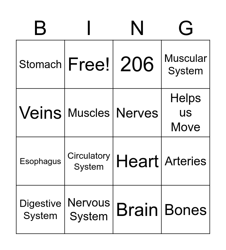 This bingo card has 19 words: Heart, 600, 206, Bones, Arteries, Veins, Brain, Stomach, Free!, Esophagus, Circulatory System, Muscles, Nerves, Nervous System, Digestive System, Skeletal System, Muscular System, Helps us Move and Skull.