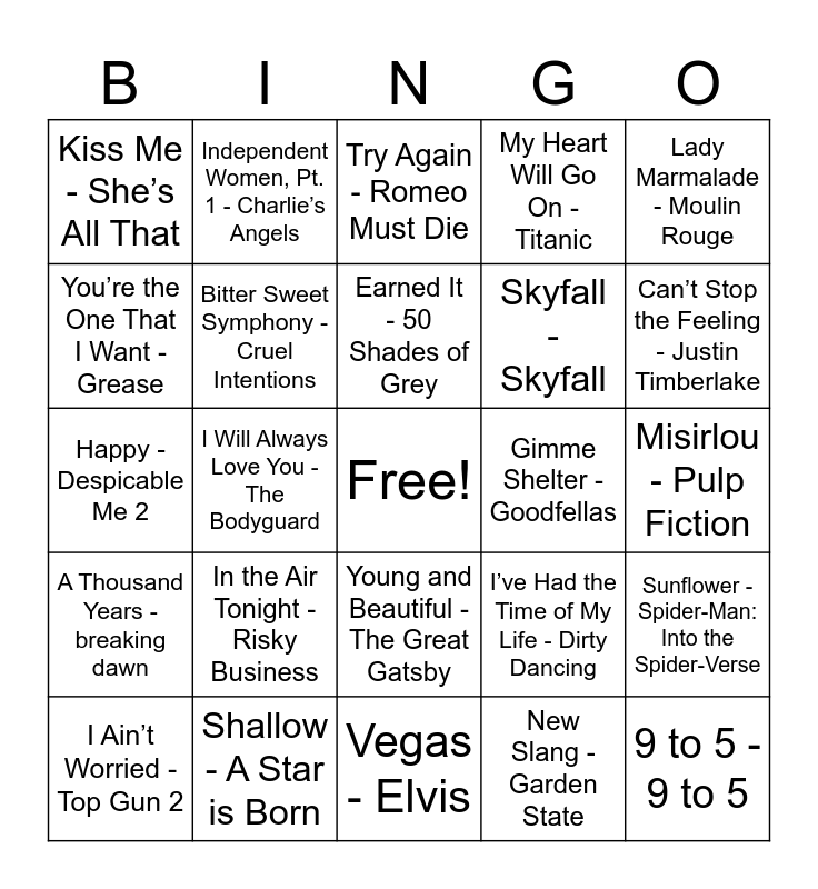 This bingo card has a free space and 41 words: Lose Yourself - 8 Mile, Happy - Despicable Me 2, Dance The Night - Barbie, Bitter Sweet Symphony - Cruel Intentions, Shallow - A Star is Born, Young and Beautiful - The Great Gatsby, Earned It - 50 Shades of Grey, All The Stars - Black Panther, Lady Marmalade - Moulin Rouge, A Thousand Years - breaking dawn, I Will Always Love You - The Bodyguard, My Heart Will Go On - Titanic, 9 to 5 - 9 to 5, Misirlou - Pulp Fiction, Gimme Shelter - Goodfellas, In the Air Tonight - Risky Business, Danger Zone - Top Gun, Kiss Me - She’s All That, Iris - City of Angels, Try Again - Romeo Must Die, Sunflower - Spider-Man: Into the Spider-Verse, Stayin’ Alive - Saturday Night Fever, Vegas - Elvis, Skyfall - Skyfall, Sucker for Pain - Suicide Squad, See You Again - Furious 7, New Slang - Garden State, Mad World - Donnie Darko, Can’t Stop the Feeling - Justin Timberlake, Eye of the Tiger - Rocky IV, Gangsta’s Paradise - Dangerous Minds, Independent Women, Pt. 1 - Charlie’s Angels, I Ain’t Worried - Top Gun 2, The Power of Love - Back to the Future, I’ve Had the Time of My Life - Dirty Dancing, You’re the One That I Want - Grease, Unchained Melody - Ghost, Live and Let Die - Live and Let Die (and Shrek), Mrs. Robinson - The Graduate, Oh Yeah - Ferris Bueller’s Day Off and Mr. Blue Sky - Megamind/Super Mario Bros. Movie/Guardians of the Galaxy Vol. 2.