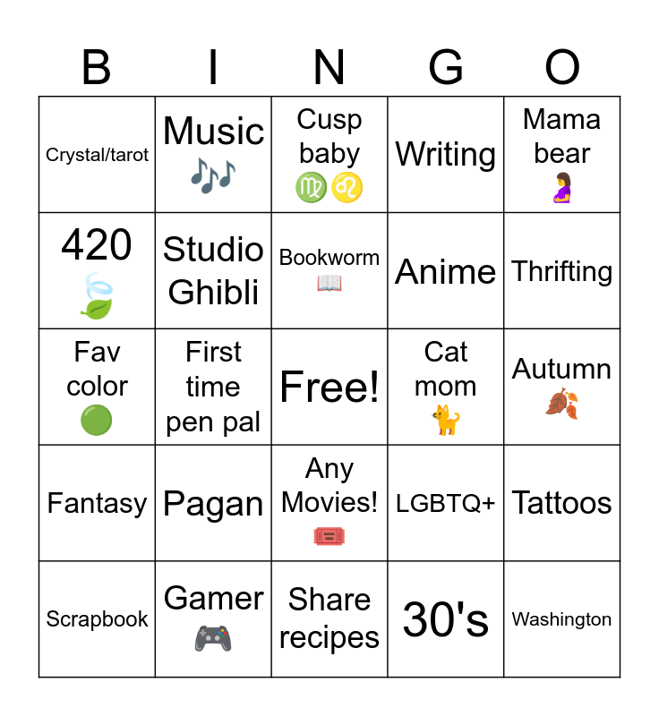 This bingo card has a free space and 24 words: Pagan, Gamer 🎮, Bookworm 📖, Scrapbook, Mama bear 🤰, Crystal/tarot, 420 🍃, Music 🎶, Cat mom 🐈, Any Movies! 🎟, Anime, Fav color 🟢, LGBTQ+, Tattoos, Studio Ghibli, 30's, Autumn 🍂, Cusp baby ♍️♌️, Thrifting, First time pen pal, Washington, Fantasy, Writing and Share recipes.