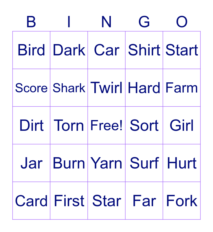This bingo card has a free space and 31 words: Star, Sport, Torn, Short, Bird, Car, Shark, Surf, Sort, Far, Girl, Fork, Curl, Park, Farm, Fort, Hurt, Burn, Jar, Yarn, Start, Smart, Card, Dark, Hard, Score, Shirt, Dirt, First, Twirl and Turn.