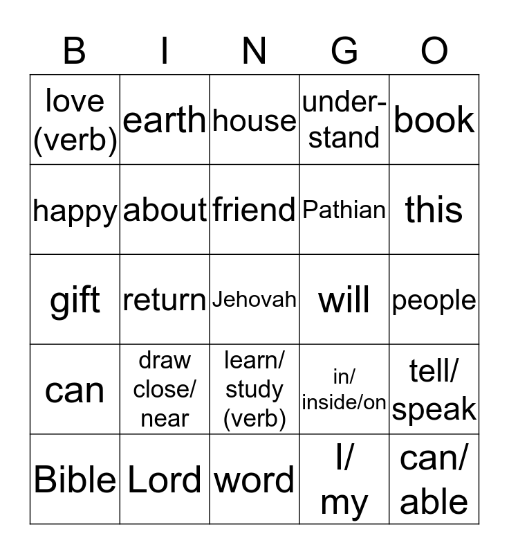 This bingo card has a free space and 24 words: draw close/ near, Lord, friend, Bible, book, love (verb), happy, earth, will, learn/ study (verb), Pathian, gift, in/ inside/on, tell/ speak, about, I/ my, people, house, this, return, can/ able, can, under-stand and word.
