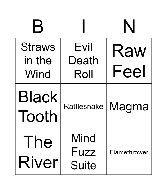 This bingo card has a free space and 8 words: Magma, Raw Feel, Evil Death Roll, The River, Straws in the Wind, Flamethrower, Black Tooth and Mind Fuzz Suite.
