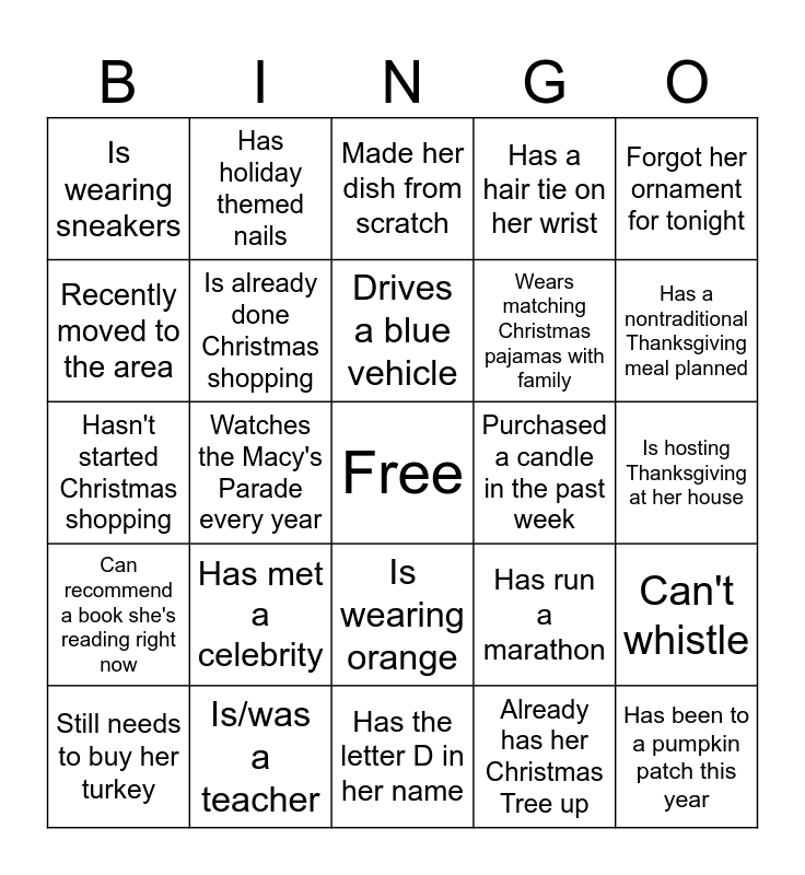 This bingo card has a free space and 39 words: Has been to the movie theater this month, Has the same birth month as you, Calls it dressing instead of stuffing, Is already done Christmas shopping, Still needs to buy her turkey, Is wearing orange, Drives a blue vehicle, Bought her dish from the store, Forgot her ornament for tonight, Can recommend a book she's reading right now, Watches the Macy's Parade every year, Has a hair tie on her wrist, Has been to a pumpkin patch this year, Is hosting Thanksgiving at her house, Purchased a candle in the past week, Has met a celebrity, Is willing to show you the last picture on her phone, Is wearing sneakers, Works/worked in healthcare, Has run a marathon, Recently moved to the area, Has the letter D in her name, Wears matching Christmas pajamas with family, Has a nontraditional Thanksgiving meal planned, Has a trip planned this holiday season, Brought a friend tonight, Has a green phone case, Watches the same movie every Christmas, Gets Christmas presents for her pets, Has holiday themed nails, Prefers tea over coffee, Eats dessert first, Made her dish from scratch, Is/was a teacher, Already has her Christmas Tree up, Has flowers on her outfit, Can't whistle, Hasn't started Christmas shopping and Likes pineapple on pizza.