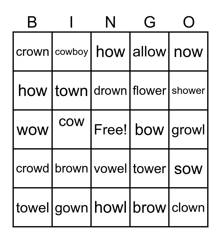 This bingo card has a free space and 29 words: towel, crown, cow, down, crown, how, town, brown, bow, gown, growl, clown, howl, brow, shower, frown, vowel, crowd, now, wow, tower, power, flower, how, allow, cowboy, sow, drown and prowl.