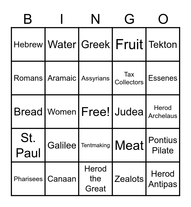 This bingo card has a free space and 29 words: Pharisees, Sadducees, Women, Samaritans, Hebrew, Greek, Aramaic, Galilee, Judea, Canaan, Herod Archelaus, Herod Antipas, Herod the Great, Zealots, Essenes, Fishermen, Tentmaking, St. Paul, Tekton, Bread, Meat, Idumaea, Tax Collectors, Romans, Fruit, Water, Pontius Pilate, Assyrians and Palestine.