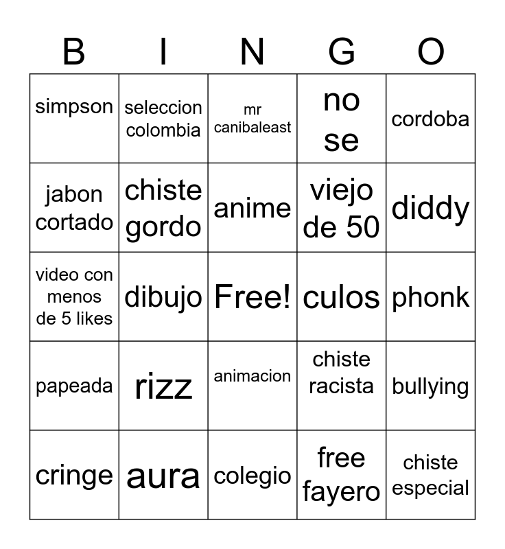 This bingo card has a free space and 24 words: rizz, aura, anime, cringe, cordoba, simpson, jabon cortado, seleccion colombia, culos, animacion, viejo de 50, video con menos de 5 likes, chiste racista, bullying, chiste gordo, free fayero, phonk, mr canibaleast, diddy, dibujo, chiste especial, papeada, no se and colegio.
