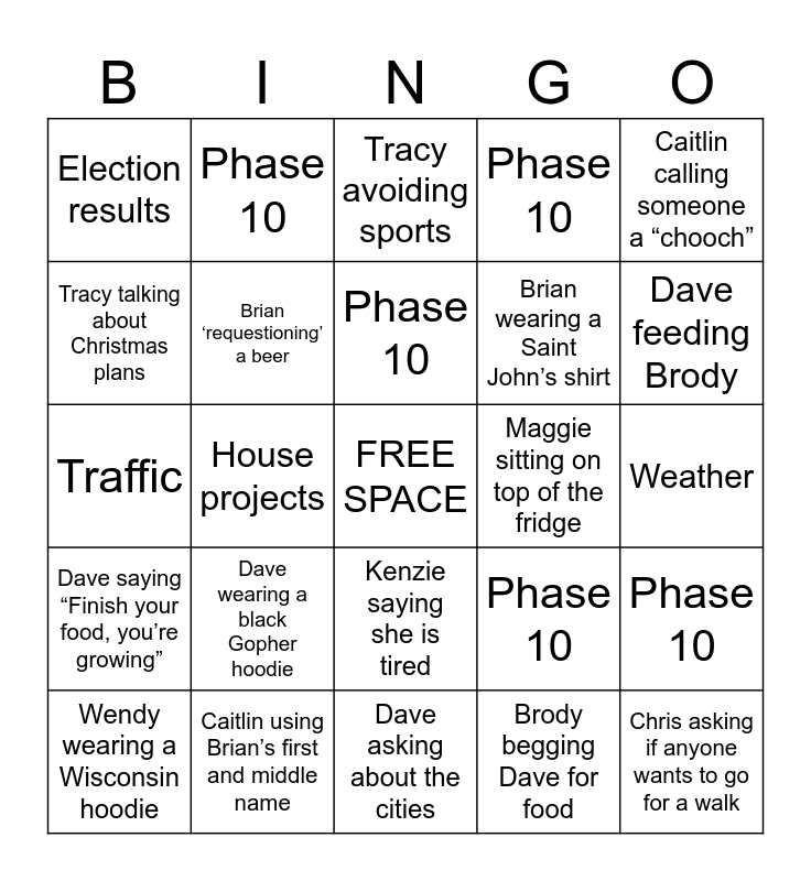This bingo card has a free space and 29 words: Wendy wearing a Wisconsin hoodie, Travel, House projects, Dave bringing up ‘Gunsmoke’, Election results, Tracy avoiding sports, Brian ‘requestioning’ a beer, Dave wearing a black Gopher hoodie, Maggie sitting on top of the fridge, Caitlin using Brian’s first and middle name, Weather, Chris asking if anyone wants to go for a walk, Dave asking about the cities, Brody begging Dave for food, Dave feeding Brody, Wendy giving Maggie a treat, Kenzie saying she is tired, Dave saying “Finish your food, you’re growing”, Caitlin calling someone a “chooch”, Traffic, Phase 10, Chris explaining a beer, Brian wearing a Saint John’s shirt, Tracy talking about Christmas plans, Phase 10, Phase 10, Phase 10, Phase 10 and Phase 10.