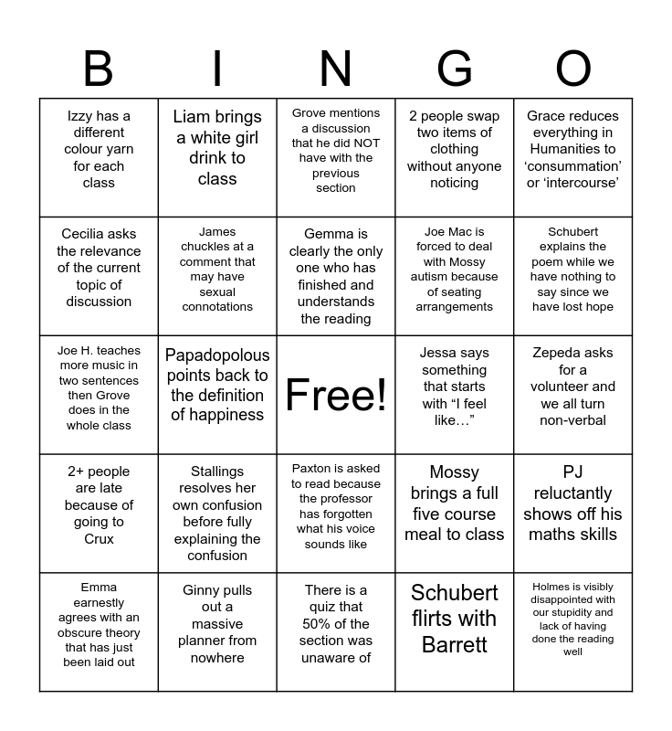 This bingo card has a free space and 24 words: Stallings resolves her own confusion before fully explaining the confusion, Ginny pulls out a massive planner from nowhere, Gemma is clearly the only one who has finished and understands the reading, Emma earnestly agrees with an obscure theory that has just been laid out, Grace reduces everything in Humanities to ‘consummation’ or ‘intercourse’, Izzy has a different colour yarn for each class, Cecilia asks the relevance of the current topic of discussion, Liam brings a white girl drink to class, Jessa says something that starts with “I feel like…”, Paxton is asked to read because the professor has forgotten what his voice sounds like, Joe Mac is forced to deal with Mossy autism because of seating arrangements, Joe H. teaches more music in two sentences then Grove does in the whole class, Mossy brings a full five course meal to class, PJ reluctantly shows off his maths skills, James chuckles at a comment that may have sexual connotations, Schubert flirts with Barrett, Zepeda asks for a volunteer and we all turn non-verbal, Grove mentions a discussion that he did NOT have with the previous section, Schubert explains the poem while we have nothing to say since we have lost hope, Papadopolous points back to the definition of happiness, Holmes is visibly disappointed with our stupidity and lack of having done the reading well, 2+ people are late because of going to Crux, 2 people swap two items of clothing without anyone noticing and There is a quiz that 50% of the section was unaware of.