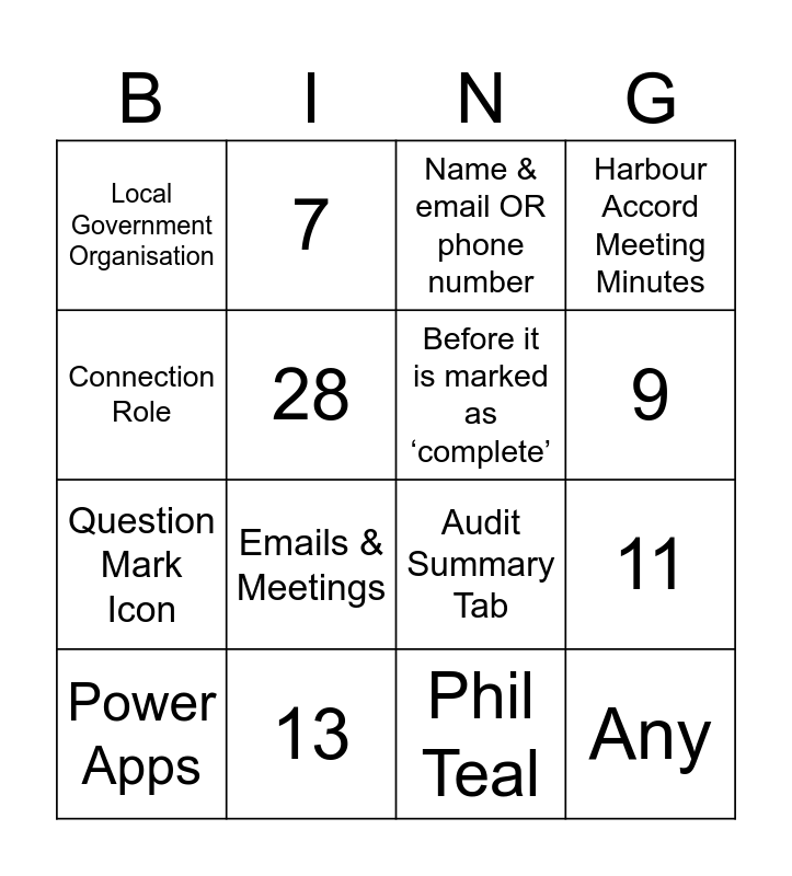 This bingo card has 16 words: 13, 11, Name & email OR phone number, Local Government Organisation, Question Mark Icon, 7, Audit Summary Tab, Phil Teal, Connection Role, 28, Power Apps, Harbour Accord Meeting Minutes, Emails & Meetings, 9, Before it is marked as ‘complete’ and Any.