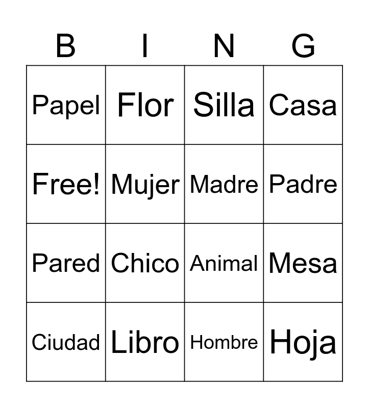 This bingo card has 16 words: Libro, Mesa, Silla, Papel, Pared, Flor, Animal, Hombre, Free!, Mujer, Ciudad, Casa, Chico, Padre, Madre and Hoja.