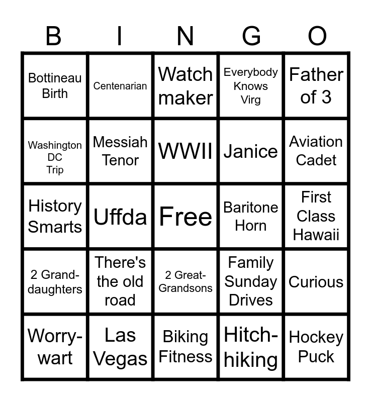 This bingo card has a free space and 29 words: Worry- wart, 100 percent, Uffda, Six Siblings, Bottineau Birth, Watch maker, Messiah Tenor, There's the old road, Baritone Horn, Las Vegas, First Class Hawaii, Hockey Puck, Biking Fitness, Hitch-hiking, Aviation Cadet, Trivia Master, 2 Great-Grandsons, 2 Grand-daughters, Father of 3, History Smarts, Family Sunday Drives, Golf, Janice, Washington DC Trip, Everybody Knows Virg, Centenarian, Curious, WWII and Norwegian.