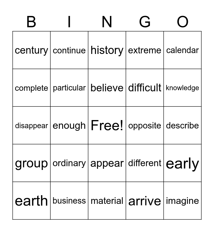 This bingo card has a free space and 26 words: appear, arrive, believe, business, calendar, century, complete, continue, describe, different, difficult, disappear, early, earth, enough, experiment, extreme, group, history, imagine, knowledge, material, opposite, ordinary, particular and peculiar.