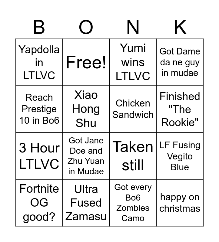 This bingo card has 16 words: Ultra Fused Zamasu, LF Fusing Vegito Blue, Yumi wins LTLVC, Yapdolla in LTLVC, 3 Hour LTLVC, Free!, Taken still, Got every Bo6 Zombies Camo, Reach Prestige 10 in Bo6, Xiao Hong Shu, Fortnite OG good?, Got Dame da ne guy in mudae, Got Jane Doe and Zhu Yuan in Mudae, Finished "The Rookie", Chicken Sandwich and happy on christmas.