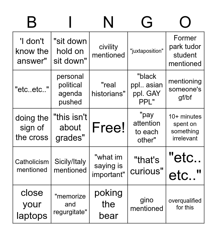 This bingo card has a free space and 29 words: close your laptops, IU music school mentioned, "this isn't about grades", silenced and in the backpack, 'I don't know the answer", civility mentioned, personal political agenda pushed, Sicily/Italy mentioned, "pay attention to each other", "memorize and regurgitate", 10+ minutes spent on something irrelevant, overqualified for this, poking the bear, gino mentioned, mentioning someone's gf/bf, "agenda", "what im saying is important", Catholicism mentioned, Former park tudor student mentioned, doing the sign of the cross, "that's curious", "be a thinker", "black ppl.. asian ppl. GAY PPL", "etc..etc..", "juxtaposition", "sit down hold on sit down", "etc.. etc..", "real historians" and swear word.