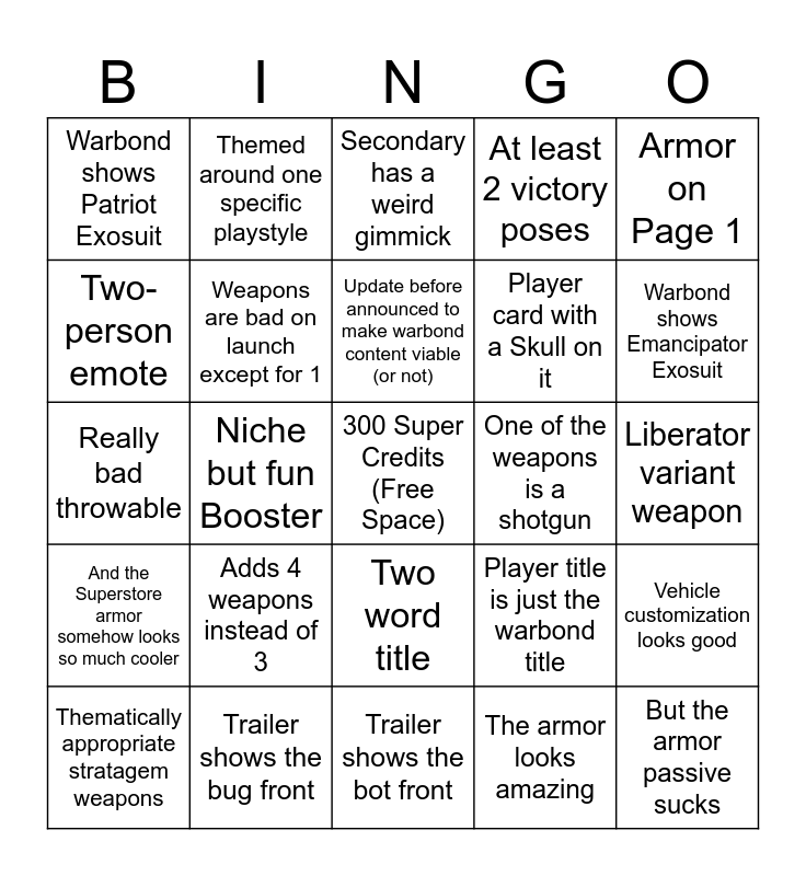 This bingo card has a free space and 24 words: Adds 4 weapons instead of 3, Trailer shows the bug front, Update before announced to make warbond content viable (or not), Thematically appropriate stratagem weapons, Armor on Page 1, Warbond shows Patriot Exosuit, Two-person emote, Themed around one specific playstyle, One of the weapons is a shotgun, Two word title, Player card with a Skull on it, Really bad throwable, Player title is just the warbond title, Vehicle customization looks good, Weapons are bad on launch except for 1, The armor looks amazing, Liberator variant weapon, Secondary has a weird gimmick, Warbond shows Emancipator Exosuit, Niche but fun Booster, But the armor passive sucks, And the Superstore armor somehow looks so much cooler, At least 2 victory poses and Trailer shows the bot front.