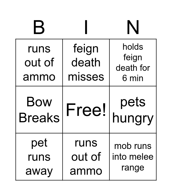 This bingo card has a free space and 11 words: bow breaks, runs out of ammo, mob runs into melee range, pet runs away, feign death misses, holds feign death for 6 min, pets hungry, hold up need mana, Bow Breaks, runs out of ammo and mob runs into melee range.
