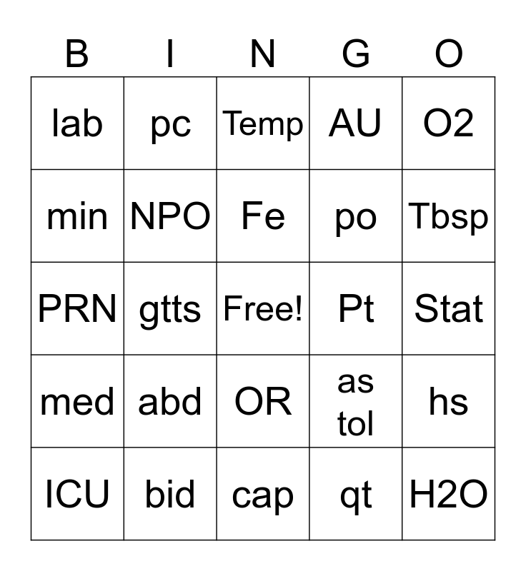 This bingo card has a free space and 24 words: abd, bid, Fe, ICU, O2, lab, min, pc, Pt, OR, po, PRN, as tol, hs, NPO, qt, Stat, Temp, Tbsp, gtts, H2O, med, AU and cap.