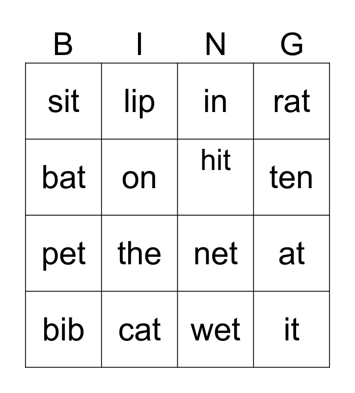 This bingo card has 16 words: cat, at, in, sit, pet, lip, net, wet, bat, on, bib, rat, the, ten, hit and it.