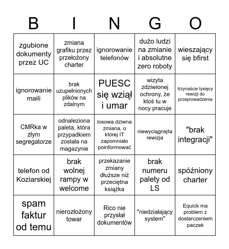 This bingo card has a free space and 24 words: brak wolnej rampy w welcome, nierozłożony towar, PUESC się wziął i umar, spam faktur od temu, wieszający się bfirst, zgubione dokumenty przez UC, ignorowanie maili, zmiana grafiku przez przełożony charter, niewyciągnięta rewizja, przekazanie zmiany dłuższe niż przeciętna książka, wizyta zdziwionej ochrony, że ktoś tu w nocy pracuje, CMRka w złym segregatorze, brak numeru palety od LS, spóźniony charter, brak uzupełnionych plików na zdalnym, "niedziałający system", "brak integracji", ignorowanie telefonów, trzynaście tysięcy rewizji do przeprowadzenia, odnaleziona paleta, która przypadkiem została na magazynie, Equick ma problem z dostarczeniem paczek, telefon od Koziarskiej, dużo ludzi na zmianie i absolutne zero roboty and Rico nie przysłał dokumentów.