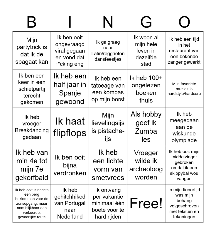 This bingo card has 30 words: Ik heb gehitchhiked van Portugal naar Nederland, Ik had 20 jr een valkparkiet als huisdier, Ik haat flipflops, Ik ben deels Hongaars (1/8e), Mijn partytrick is dat ik de spagaat kan, Ik ga graag naar Latin/reggaeton dansfeestjes, Ik heb een half jaar in Spanje gewoond, Ik heb een lichte vorm van smetvrees, Als hobby geef ik Zumba les, Ik ontvang per vakantie minimaal één boete voor te hard rijden, Ik heb meegedaan aan de wiskunde olympiade, Mijn lievelingsijs is pistache-ijs, Free!, In mijn tienertijd was mijn behang volgeschreven met teksten en tekeningen, Mijn favoriete muziek is hardstyle/hardcore, De mooiste voetbalclub vind ik Roda JC, Vroeger wilde ik archeoloog worden, Ik heb van m’n 4e tot mijn 7e gekorfbald, Ik ben ooit bijna verdronken, Ik heb een tijd in het restaurant van een bekende zanger gewerkt, Ik heb vroeger Breakdancing gedaan, Mijn stiekeme crush is Annechien Steenhuizen (NOS nieuwslezeres), Ik ben ooit ongevraagd viral gegaan en vond dat f*cking eng, Ik heb 100+ ongelezen boeken thuis, Ik ben een keer in een schietpartij terecht gekomen, Ik woon al mijn hele leven in dezelfde stad, Ik heb ooit mijn middelvinger gebroken omdat ik een skippybal wou vangen, Ik heb ooit ‘s nachts een berg beklommen voor de zonsopgang, maar nam blijkbaar een verkeerde, gevaarlijke route, Ik heb een tatoeage van een kompas op mijn borst and Ik heb in Duitsland en Schotland gewoond.