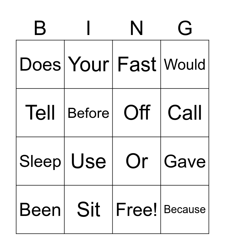 This bingo card has 17 words: Free!, Been, Fast, Does, Use, Would, Gave, Off, Call, Before, Sit, Or, Tell, Your, Sleep, Always and Because.