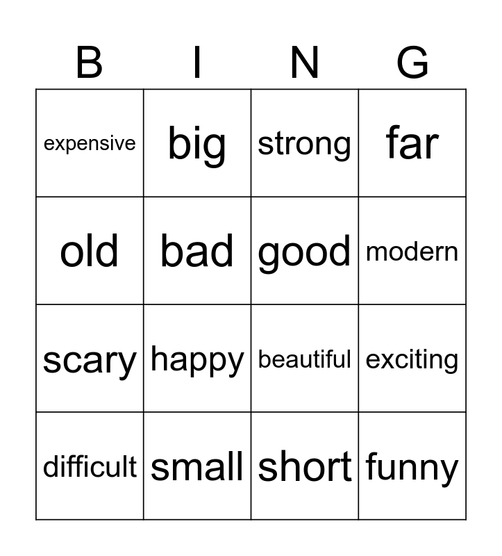 This bingo card has 16 words: small, exciting, strong, expensive, scary, big, beautiful, short, old, bad, difficult, far, happy, modern, good and funny.