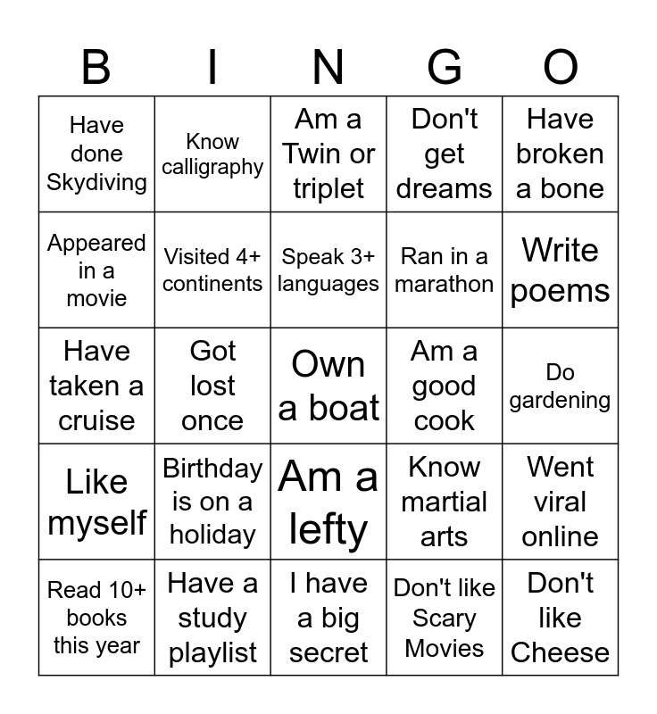 This bingo card has a free space and 24 words: Birthday is on a holiday, Have a study playlist, Speak 3+ languages, Read 10+ books this year, Have broken a bone, Have done Skydiving, Appeared in a movie, Know calligraphy, Am a good cook, Am a lefty, Ran in a marathon, Have taken a cruise, Know martial arts, Went viral online, Visited 4+ continents, Don't like Scary Movies, Do gardening, Am a Twin or triplet, Write poems, Got lost once, Don't like Cheese, Like myself, Don't get dreams and I have a big secret.