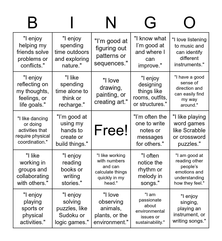 This bingo card has a free space and 24 words: "I enjoy reading books or writing stories.", "I enjoy solving puzzles, like Sudoku or logic games.", "I love drawing, painting, or creating art.", "I enjoy playing sports or physical activities.", "I love listening to music and can identify different instruments.", "I enjoy helping my friends solve problems or conflicts.", "I enjoy reflecting on my thoughts, feelings, or life goals.", "I enjoy spending time outdoors and exploring nature.", "I’m often the one to write notes or messages for others.", "I like working with numbers and can calculate things quickly in my head.", "I enjoy designing things like rooms, outfits, or structures.", "I like dancing or doing activities that require physical coordination.", "I often notice the rhythm or melody in songs.", "I am good at reading other people’s emotions and understanding how they feel.", "I like spending time alone to think or recharge.", "I am passionate about environmental issues or sustainability.", "I like playing word games like Scrabble or crossword puzzles.", "I’m good at figuring out patterns or sequences.", "I have a good sense of direction and can easily find my way around.", "I’m good at using my hands to create or build things.", "I enjoy singing, playing an instrument, or writing songs.", "I like working in groups and collaborating with others.", "I know what I’m good at and where I can improve." and "I love observing animals, plants, or the environment.".
