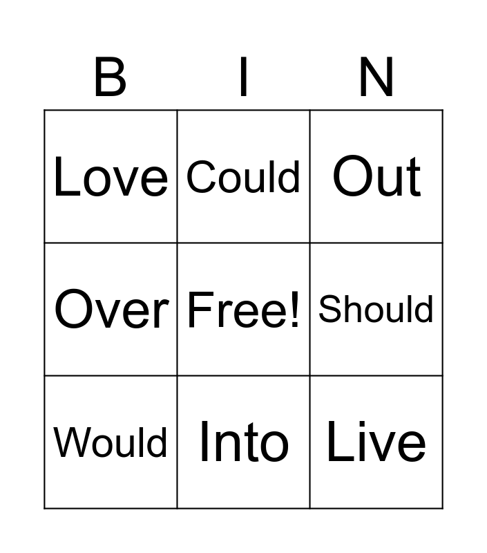 This bingo card has a free space and 8 words: Should, Out, Could, Would, Love, Live, Over and Into.