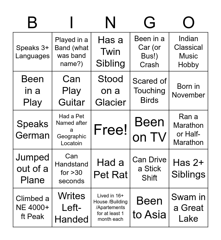 This bingo card has a free space and 24 words: Can Handstand for >30 seconds, Writes Left-Handed, Stood on a Glacier, Climbed a NE 4000+ ft Peak, Indian Classical Music Hobby, Speaks 3+ Languages, Been in a Play, Played in a Band (what was band name?), Been on TV, Had a Pet Rat, Scared of Touching Birds, Speaks German, Can Drive a Stick Shift, Has 2+ Siblings, Can Play Guitar, Been to Asia, Ran a Marathon or Half-Marathon, Has a Twin Sibling, Born in November, Had a Pet Named after a Geographic Locatoin, Swam in a Great Lake, Jumped out of a Plane, Been in a Car (or Bus!) Crash and Lived in 16+ House /Building /Apartements for at least 1 month each.