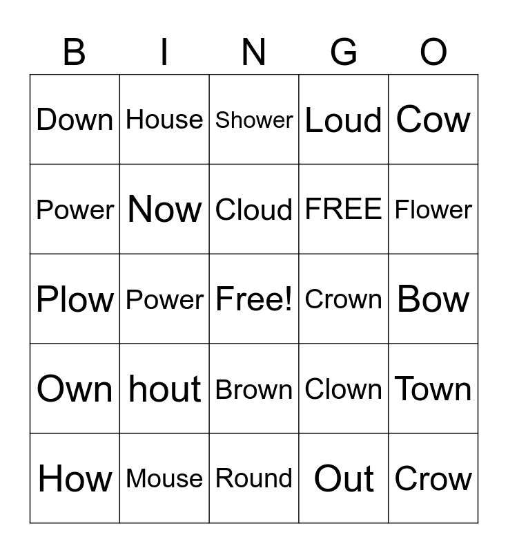 This bingo card has a free space and 24 words: hout, Mouse, Cloud, How, Cow, Down, Power, House, Crown, Brown, FREE, Plow, Clown, Town, Now, Out, Bow, Shower, Flower, Power, Crow, Own, Loud and Round.