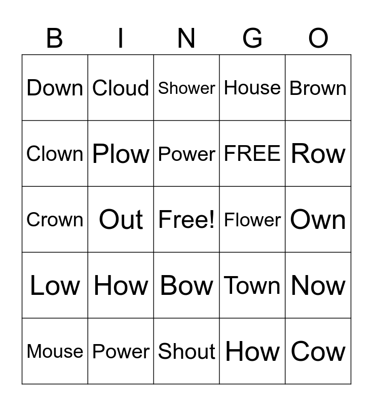 This bingo card has a free space and 25 words: How, Shout, Power, Mouse, Brown, Down, Clown, Cloud, Flower, Bow, FREE, Crown, Town, Now, Plow, Loud, Own, Shower, Row, Out, Cow, Power, Low, House and How.