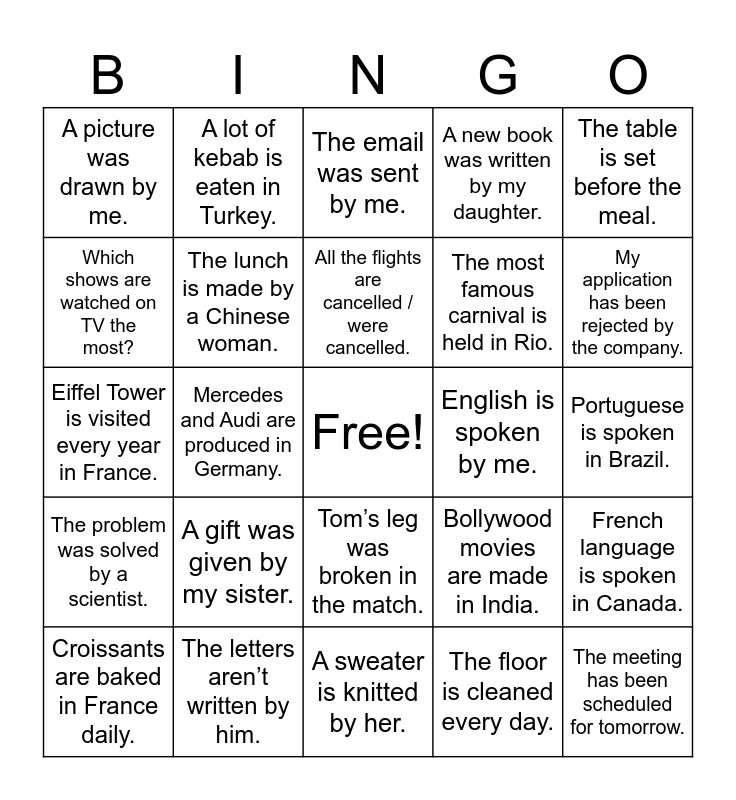 This bingo card has a free space and 26 words: Tom’s leg was broken in the match., The floor is cleaned every day., All the flights are cancelled / were cancelled., The letters aren’t written by him., The table is set before the meal., A picture was drawn by me., Which shows are watched on TV the most?, A lot of kebab is eaten in Turkey., Portuguese is spoken in Brazil., Bollywood movies are made in India., The most famous carnival is held in Rio., Eiffel Tower is visited every year in France., French language is spoken in Canada., Croissants are baked in France daily., Mercedes and Audi are produced in Germany., The exam was completed by all the students., A new book was written by my daughter., The problem was solved by a scientist., The email was sent by me., The meeting has been scheduled for tomorrow., My application has been rejected by the company., A sweater is knitted by her., English is spoken by me., A gift was given by my sister., The lunch is made by a Chinese woman. and The carpet was sewn by me..