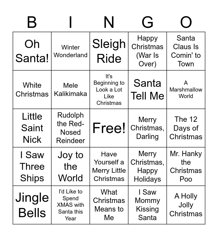 This bingo card has a free space and 76 words: It's the Most Wonderful Time of the Year, Rockin' Around the Christmas Tree, Sleigh Ride, Let It Snow, Here Comes Santa Claus, Blue Christmas, Happy Holiday, Last Christmas, All I Want for Christmas is You, Carol of the Bells, Feliz Navidad, Jingle Bell Rock, It's Beginning to Look a Lot Like Christmas, White Christmas, Christmas (Baby Please Come Home), Rudolph the Red-Nosed Reindeer, Santa Baby, A Holly Jolly Christmas, O Holy Night, Santa Claus Is Comin' to Town, Silver Bells, Little Saint Nick, Mele Kalikimaka, Winter Wonderland, Happy Christmas (War Is Over), Run Rudolph Run, (There's No Place Like) Home for the Holidays, I want an Hippopotamus for Christmas, 12 Pains of Christmas, Baby, It's Cold Outside, Christmas Time Is Here, Mary Did You Know, Sleigh Ride, Merry Christmas, Happy Holidays, A Marshmallow World, Santa Tell Me, Up on the House Top, My Favorite Things, The 12 Days of Christmas, I Saw Mommy Kissing Santa, The Little Drummer Boy, The First Noel, Linus and Lucy, Grandma Got Run over by a Reindeer, Deck the Halls, Do You Hear What Hear?, Jingle Bells, Oh Santa!, Frosty the Snowman, A Smoky Mountain Christmas, You're a Mean One, Mr. Grinch, Have Yourself a Merry Little Christmas, Christmas in Dixie, Silent Night, Like It's Christmas, Hark! The Herald Angels Sing, Wonderful Christmastime, This Christmas, Mistletoe and Holly, The Man With All the Toys, Joy to the World, God Rest Ye Merry Gentleman, Please Come Home for Christmas, Angles We Have Heard On High, Step Into Christmas, Caroling, Caroling, Merry Christmas, Darling, Someday At Christmas, Do They Know It's Christmas, O Tannenbaum, Mr. Hanky the Christmas Poo, I Saw Three Ships, I'd Like to Spend XMAS with Santa this Year, The Chipmunk Song, What Christmas Means to Me and Peace on Earth/Little Drummer Boy.