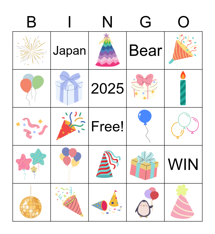 This bingo card has 24 images, a free space and 5 words: Bear, Japan, WIN, 2025 and Party.