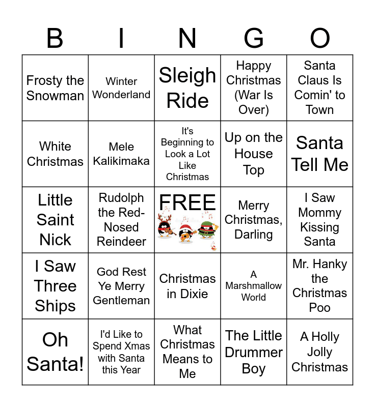 This bingo card has a free space and 75 words: It's the Most Wonderful Time of the Year, Rockin' Around the Christmas Tree, Sleigh Ride, Let It Snow, Here Comes Santa Claus, Blue Christmas, Happy Holiday, Last Christmas, All I Want for Christmas is You, Carol of the Bells, Feliz Navidad, Jingle Bell Rock, It's Beginning to Look a Lot Like Christmas, White Christmas, Christmas (Baby Please Come Home), Rudolph the Red-Nosed Reindeer, Santa Baby, A Holly Jolly Christmas, O Holy Night, Santa Claus Is Comin' to Town, Silver Bells, Little Saint Nick, Mele Kalikimaka, Winter Wonderland, Happy Christmas (War Is Over), Run Rudolph Run, (There's No Place Like) Home for the Holidays, I want an Hippopotamus for Christmas, 12 Pains of Christmas, Baby, It's Cold Outside, Christmas Time Is Here, Mary Did You Know, Merry Christmas, Happy Holidays, A Marshmallow World, Santa Tell Me, Up on the House Top, My Favorite Things, The 12 Days of Christmas, I Saw Mommy Kissing Santa, The Little Drummer Boy, The First Noel, Linus and Lucy, Grandma Got Run over by a Reindeer, Deck the Halls, Do You Hear What Hear?, Jingle Bells, Oh Santa!, Frosty the Snowman, A Smoky Mountain Christmas, You're a Mean One, Mr. Grinch, Have Yourself a Merry Little Christmas, Christmas in Dixie, Silent Night, Like It's Christmas, Hark! The Herald Angels Sing, Wonderful Christmastime, This Christmas, Mistletoe and Holly, The Man With All the Toys, Joy to the World, God Rest Ye Merry Gentleman, Please Come Home for Christmas, Angles We Have Heard on High, Step Into Christmas, Caroling, Caroling, Merry Christmas, Darling, Someday At Christmas, Do They Know It's Christmas, O Tannenbaum, Mr. Hanky the Christmas Poo, I Saw Three Ships, I'd Like to Spend Xmas with Santa this Year, The Chipmunk Song, What Christmas Means to Me and Peace on Earth/Little Drummer Boy.