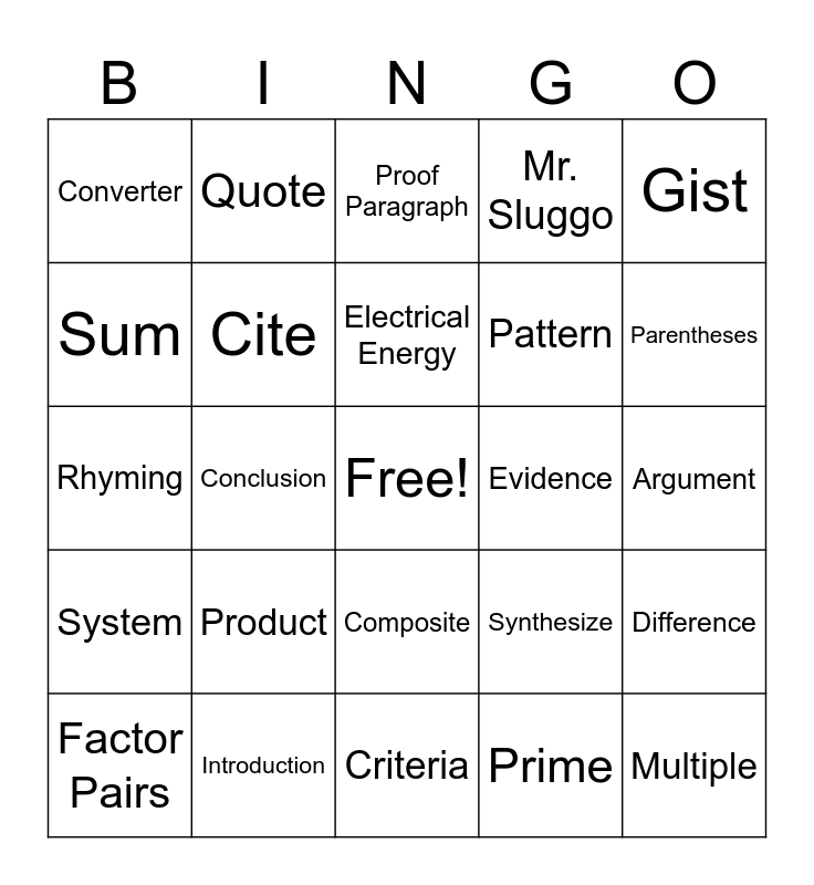 This bingo card has a free space and 24 words: Product, Introduction, Electrical Energy, Factor Pairs, Gist, Converter, Sum, Quote, Evidence, Composite, Pattern, Rhyming, Synthesize, Difference, Cite, Prime, Argument, Proof Paragraph, Parentheses, Conclusion, Multiple, System, Mr. Sluggo and Criteria.