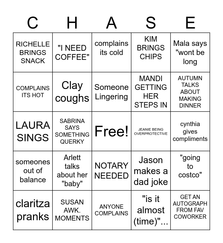 This bingo card has a free space and 24 words: Arlett talks about her "baby", SUSAN AWK. MOMENTS, Someone Lingering, claritza pranks, Mala says "wont be long, RICHELLE BRINGS SNACK, COMPLAINS ITS HOT, "I NEED COFFEE", JEANIE BEING OVERPROTECTIVE, NOTARY NEEDED, MANDI GETTING HER STEPS IN, LAURA SINGS, Jason makes a dad joke, "going to costco", Clay coughs, "is it almost (time)"..., cynthia gives compliments, complains its cold, AUTUMN TALKS ABOUT MAKING DINNER, SABRINA SAYS SOMETHING QUERKY, GET AN AUTOGRAPH FROM FAV COWORKER, someones out of balance, KIM BRINGS CHIPS and ANYONE COMPLAINS.