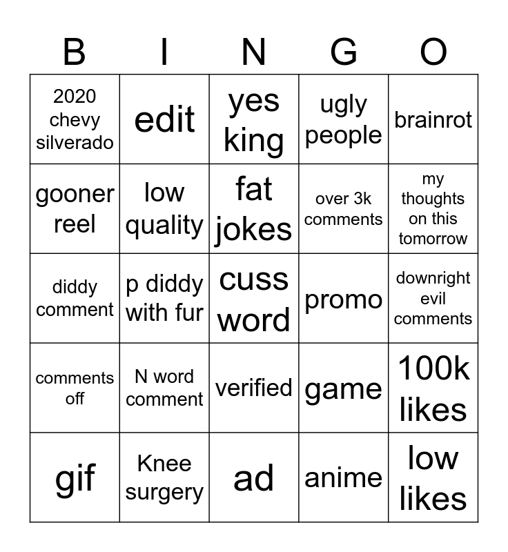 This bingo card has a free space and 24 words: N word comment, Knee surgery, fat jokes, gif, brainrot, 2020 chevy silverado, gooner reel, edit, promo, verified, over 3k comments, diddy comment, game, 100k likes, low quality, anime, downright evil comments, yes king, my thoughts on this tomorrow, p diddy with fur, low likes, comments off, ugly people and ad.