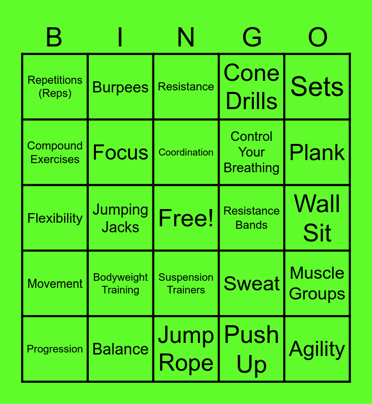This bingo card has a free space and 24 words: Bodyweight Training, Balance, Coordination, Progression, Sets, Repetitions (Reps), Compound Exercises, Burpees, Resistance Bands, Suspension Trainers, Control Your Breathing, Flexibility, Sweat, Muscle Groups, Focus, Push Up, Wall Sit, Resistance, Plank, Jumping Jacks, Agility, Movement, Cone Drills and Jump Rope.