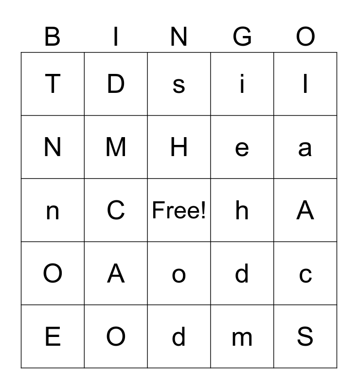 This bingo card has a free space and 24 words: A, O, H, E, I, T, N, D, h, o, e, n, d, c, M, m, A, s, a, C, S, O, i and d.