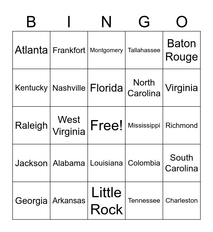 This bingo card has a free space and 24 words: Alabama, Arkansas, Florida, Georgia, Baton Rouge, Atlanta, Kentucky, Frankfort, Mississippi, Louisiana, North Carolina, Raleigh, Colombia, South Carolina, Nashville, Tennessee, Richmond, Montgomery, Virginia, West Virginia, Charleston, Jackson, Tallahassee and Little Rock.