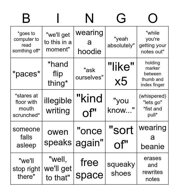 This bingo card has a free space and 24 words: owen speaks, "well, we'll get to that", "ask ourselves", "we'll stop right there", "while you're getting your notes out", *goes to computer to read somthing off*, *paces*, "we'll get to this in a moment", "you know...", "once again", "like" x5, *stares at floor with mouth scrunched*, "sort of", wearing a beanie, *hand flip thing*, squeaky shoes, (whispered) "lets go" *fist and pull*, wearing a hoodie, holding marker between thumb and index finger, illegible writing, erases and rewrites notes, someone falls asleep, "yeah absolutely" and free space.